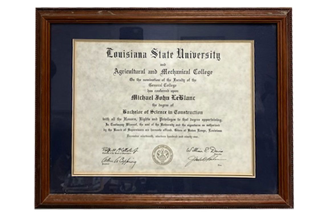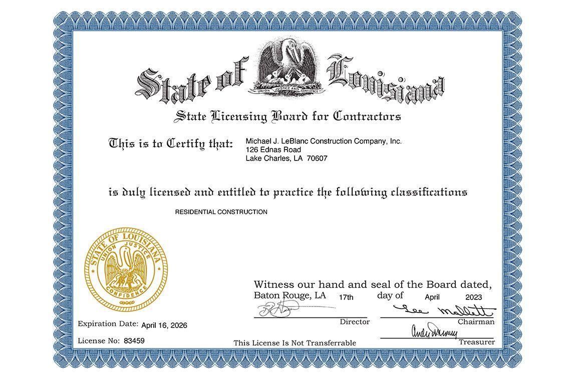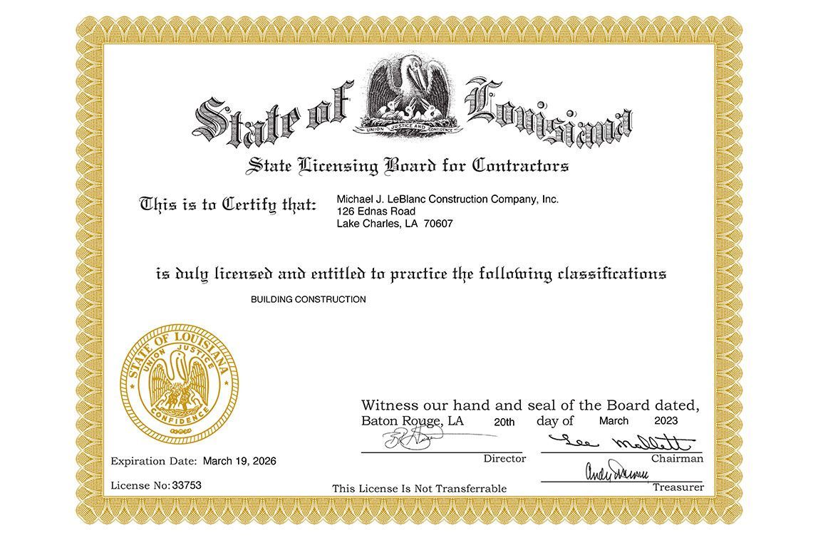 Michael J. LeBlanc Construction Company Inc. is a locally owned General Contractor by Michael LeBlanc. Michael lives and works in Lake Charles area with his wife and family. In 1991, he graduated from Louisiana State University with a Bachelor of Science degree in Construction. Michael holds licenses from the Louisiana State Licensing Board For Contractors in Building Construction and Residential Construction. The company is licensed, bonded, and insured for your security and comfort. Certificate of insurance is available upon request.